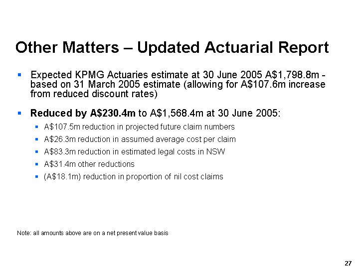 | Other Matters - Updated Actuarial Report Expected KPMG Actuaries estimate at 30 June 2005 A$1,798.8m - based on 31 March 2005 estimate (allowing for A$107.6m increase from reduced discount rates) Reduced by A$230.4m to A$1,568.4m at 30 June 2005: A$107.5m reduction in projected future claim numbers A$26.3m reduction in assumed average cost per claim A$83.3m reduction in estimated legal costs in NSW A$31.4m other reductions (A$18.1m) reduction in proportion of nil cost claims Note: all amounts above are on a net present value basis |