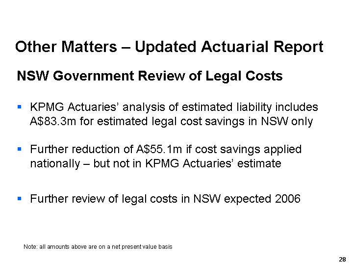| NSW Government Review of Legal Costs KPMG Actuaries' analysis of estimated liability includes A$83.3m for estimated legal cost savings in NSW only Further reduction of A$55.1m if cost savings applied nationally - but not in KPMG Actuaries' estimate Further review of legal costs in NSW expected 2006 Other Matters - Updated Actuarial Report Note: all amounts above are on a net present value basis |
