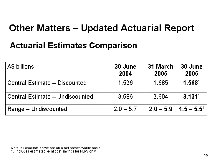 | Other Matters - Updated Actuarial Report Actuarial Estimates Comparison A$ billions 30 June 2004 31 March 2005 30 June 2005 Central Estimate - Discounted 1.536 1.685 1.5681 Central Estimate - Undiscounted 3.586 3.604 3.1311 Range - Undiscounted 2.0 - 5.7 2.0 - 5.9 1.5 - 5.51 Note: all amounts above are on a net present value basis 1. Includes estimated legal cost savings for NSW only |