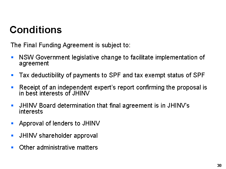| Conditions The Final Funding Agreement is subject to: NSW Government legislative change to facilitate implementation of agreement Tax deductibility of payments to SPF and tax exempt status of SPF Receipt of an independent expert's report confirming the proposal is in best interests of JHINV JHINV Board determination that final agreement is in JHINV's interests Approval of lenders to JHINV JHINV shareholder approval Other administrative matters |