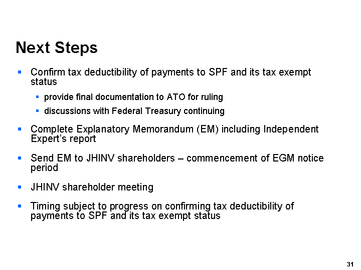 | Next Steps Confirm tax deductibility of payments to SPF and its tax exempt status provide final documentation to ATO for ruling discussions with Federal Treasury continuing Complete Explanatory Memorandum (EM) including Independent Expert's report Send EM to JHINV shareholders - commencement of EGM notice period JHINV shareholder meeting Timing subject to progress on confirming tax deductibility of payments to SPF and its tax exempt status |