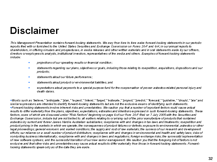 | Disclaimer This Management Presentation contains forward-looking statements. We may from time to time make forward-looking statements in our periodic reports filed with or furnished to the United States Securities and Exchange Commission on Forms 20-F and 6-K, in our annual reports to shareholders, in offering circulars and prospectuses, in media releases and other written materials and in oral statements made by our officers, directors or employees to analysts, institutional investors, representatives of the media and others. Examples of forward-looking statements include: projections of our operating results or financial condition; statements regarding our plans, objectives or goals, including those relating to competition, acquisitions, dispositions and our products; statements about our future performance; statements about product or environmental liabilities; and expectations about payments to a special purpose fund for the compensation of proven asbestos-related personal injury and death claims. Words such as "believe," "anticipate," "plan," "expect," "intend," "target," "estimate," "project," "predict," "forecast," "guideline," "should," "aim" and similar expressions are intended to identify forward-looking statements but are not the exclusive means of identifying such statements. Forward-looking statements involve inherent risks and uncertainties. We caution you that a number of important factors could cause actual results to differ materially from the plans, objectives, expectations, estimates and intentions expressed in such forward-looking statements. These factors, some of which are discussed under "Risk Factors" beginning on page 6 of our Form 20-F filed on 7 July 2005 with the Securities and Exchange Commission, include but are not limited to: all matters relating to or arising out of the prior manufacture of products that contained asbestos by current and former James Hardie Australian subsidiaries; compliance with and changes in tax laws and treatments; competition and product pricing in the markets in which we operate; the consequences of product failures or defects; exposure to environmental, asbestos or other legal proceedings; general economic and market conditions; the supply and cost of raw materials; the success of our research and development efforts; our reliance on a small number of product distributors; compliance with and changes in environmental and health and safety laws; risks of conducting business internationally; compliance with and changes in laws and regulations; foreign exchange risks; the successful implementation of new software systems; and the successful transition of our new senior management. We caution you that the foregoing list of factors is not exclusive and that other risks and uncertainties may cause actual results to differ materially from those in forward-looking statements. Forward- looking statements speak only as of the date they are made. |