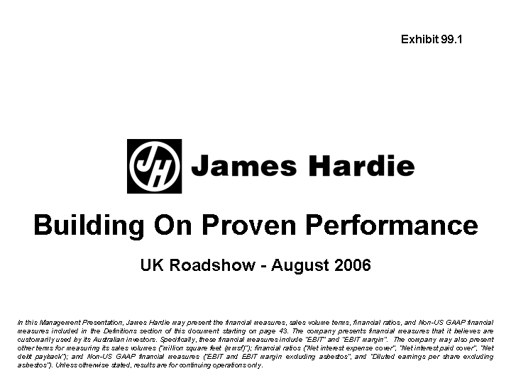 | Building On Proven Performance UK Roadshow - August 2006 In this Management Presentation, James Hardie may present the financial measures, sales volume terms, financial ratios, and Non-US GAAP financial measures included in the Definitions section of this document starting on page 43. The company presents financial measures that it believes are customarily used by its Australian investors. Specifically, these financial measures include "EBIT" and "EBIT margin". The company may also present other terms for measuring its sales volumes ("million square feet (mmsf)"); financial ratios ("Net interest expense cover", "Net interest paid cover", "Net debt payback"); and Non-US GAAP financial measures ("EBIT and EBIT margin excluding asbestos", and "Diluted earnings per share excluding asbestos"). Unless otherwise stated, results are for continuing operations only. |