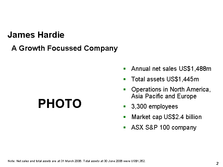 | James Hardie Annual net sales US$1,488m Total assets US$1,445m Operations in North America, Asia Pacific and Europe 3,300 employees Market cap US$2.4 billion ASX S&P 100 company Note: Net sales and total assets are at 31 March 2006. Total assets at 30 June 2006 were US$1,352. A Growth Focussed Company PHOTO |