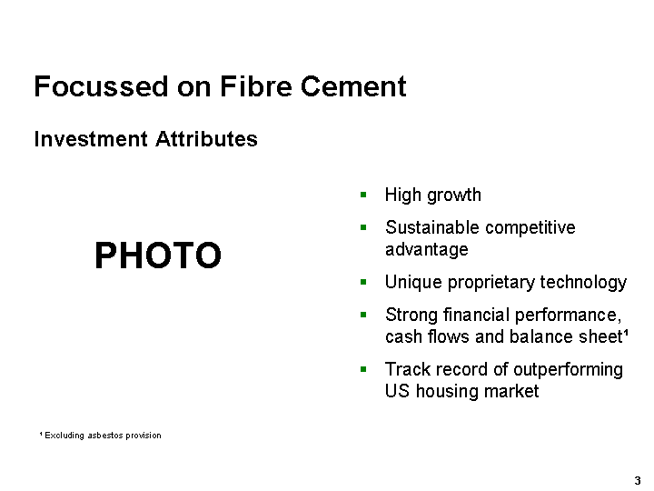| Focussed on Fibre Cement High growth Sustainable competitive advantage Unique proprietary technology Strong financial performance, cash flows and balance sheet1 Track record of outperforming US housing market Investment Attributes 1 Excluding asbestos provision PHOTO |