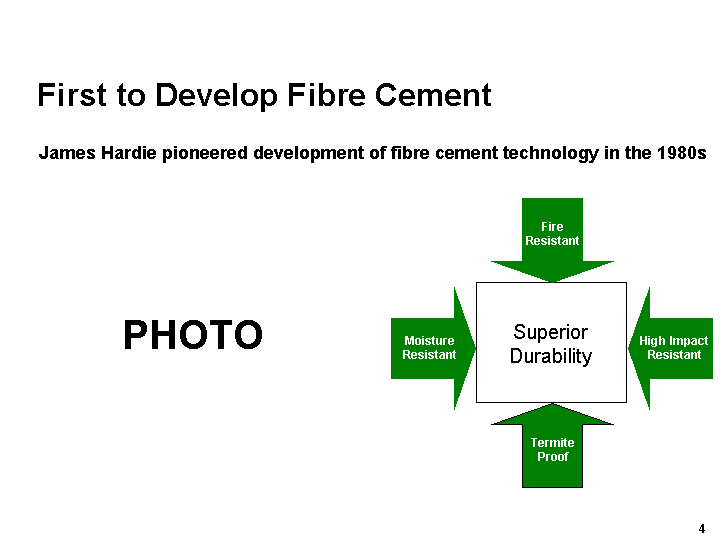 | First to Develop Fibre Cement James Hardie pioneered development of fibre cement technology in the 1980s Superior Durability Fire Resistant High Impact Resistant Moisture Resistant Termite Proof PHOTO |