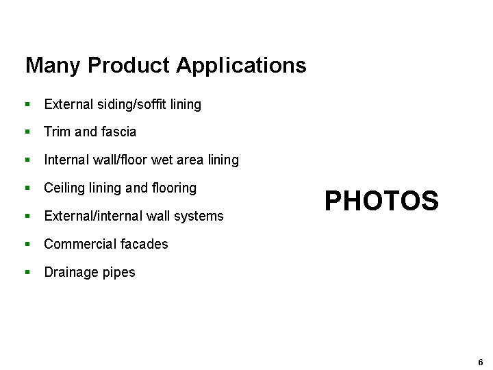 | Many Product Applications External siding/soffit lining Trim and fascia Internal wall/floor wet area lining Ceiling lining and flooring External/internal wall systems Commercial facades Drainage pipes PHOTOS |
