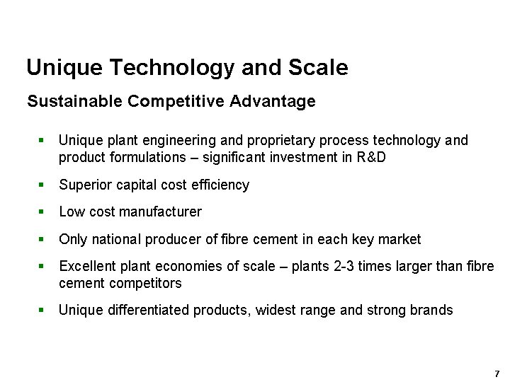 | Unique Technology and Scale Sustainable Competitive Advantage Unique plant engineering and proprietary process technology and product formulations - significant investment in R&D Superior capital cost efficiency Low cost manufacturer Only national producer of fibre cement in each key market Excellent plant economies of scale - plants 2-3 times larger than fibre cement competitors Unique differentiated products, widest range and strong brands |
