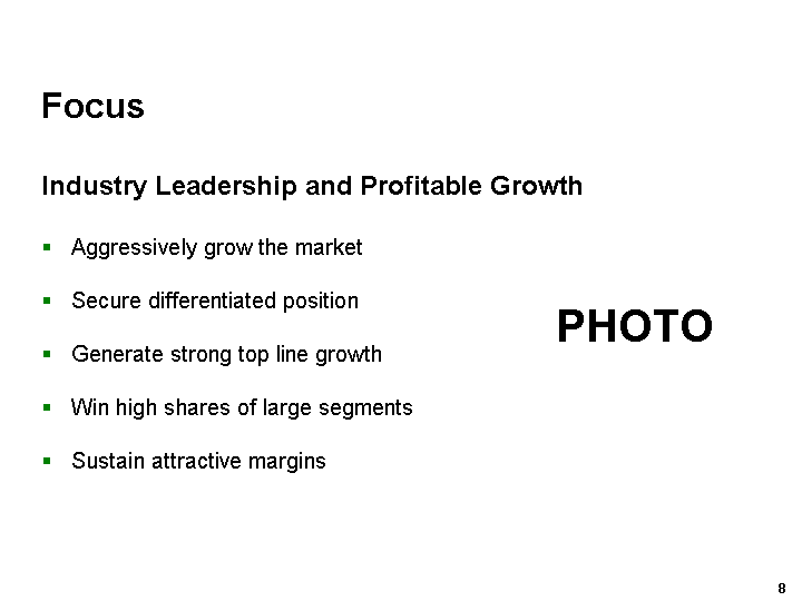 | Focus Industry Leadership and Profitable Growth Aggressively grow the market Secure differentiated position Generate strong top line growth Win high shares of large segments Sustain attractive margins PHOTO |