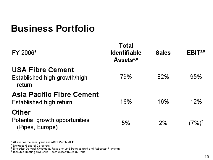 | Business Portfolio FY 20061 Total Identifiable Assets*,# Sales EBIT2,# USA Fibre Cement Established high growth/high return 79% 82% 95% Asia Pacific Fibre Cement Established high return 16% 16% 12% Other Potential growth opportunities (Pipes, Europe) 5% 2% (7%)2 1 At and for the fiscal year ended 31 March 2006 * Excludes General Corporate # Excludes General Corporate, Research and Development and Asbestos Provision 2 Includes Roofing and Chile - both discontinued in FY06 |