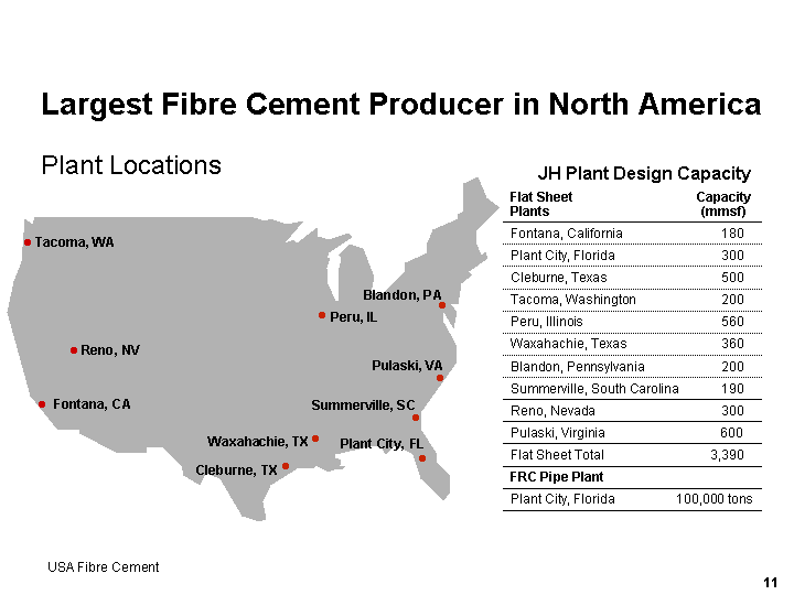 | Largest Fibre Cement Producer in North America Flat Sheet Plants Flat Sheet Plants Capacity (mmsf) Fontana, California Fontana, California 180 Plant City, Florida Plant City, Florida 300 Cleburne, Texas Cleburne, Texas 500 Tacoma, Washington Tacoma, Washington 200 Peru, Illinois Peru, Illinois 560 Waxahachie, Texas Waxahachie, Texas 360 Blandon, Pennsylvania Blandon, Pennsylvania 200 Summerville, South Carolina Summerville, South Carolina 190 Reno, Nevada Reno, Nevada 300 Pulaski, Virginia Pulaski, Virginia 600 Flat Sheet Total Flat Sheet Total 3,390 FRC Pipe Plant FRC Pipe Plant Plant City, Florida 100,000 tons 100,000 tons JH Plant Design Capacity Plant Locations USA Fibre Cement |