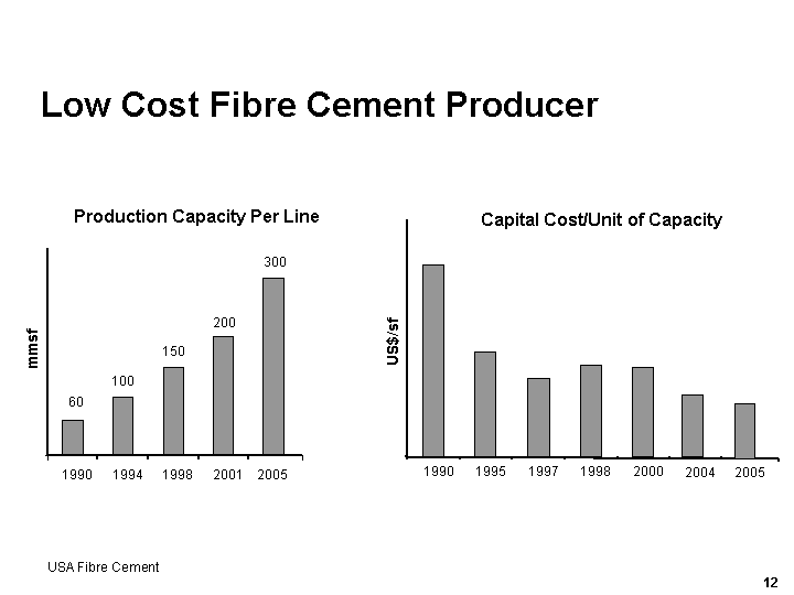 | Low Cost Fibre Cement Producer mmsf 1990 1994 1998 2001 2005 60 100 150 200 300 Production Capacity Per Line 1990 1995 1997 1998 2000 2004 US$/sf Capital Cost/Unit of Capacity 2005 USA Fibre Cement |