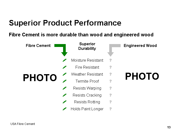 | Superior Product Performance Fibre Cement is more durable than wood and engineered wood Fibre Cement Superior Durability Moisture Resistant Fire Resistant Weather Resistant Termite Proof Resists Warping Resists Cracking Resists Rotting Holds Paint Longer ? ? ? ? ? ? ? ? ? ? ? ? ? ? ? ? Engineered Wood USA Fibre Cement PHOTO PHOTO |