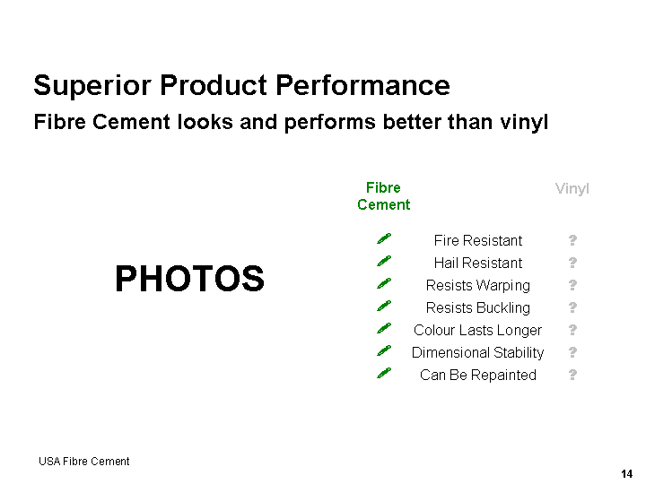 | Superior Product Performance Fibre Cement looks and performs better than vinyl Vinyl Fire Resistant Hail Resistant Resists Warping Resists Buckling Colour Lasts Longer Dimensional Stability Can Be Repainted ? ? ? ? ? ? ? ? ? ? ? ? ? ? Fibre Cement USA Fibre Cement PHOTOS |