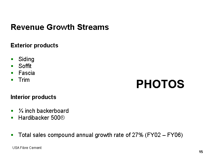| Revenue Growth Streams Exterior products Siding Soffit Fascia Trim Interior products 1/4 inch backerboard Hardibacker 500(r) Total sales compound annual growth rate of 27% (FY02 - FY06) USA Fibre Cement PHOTOS |