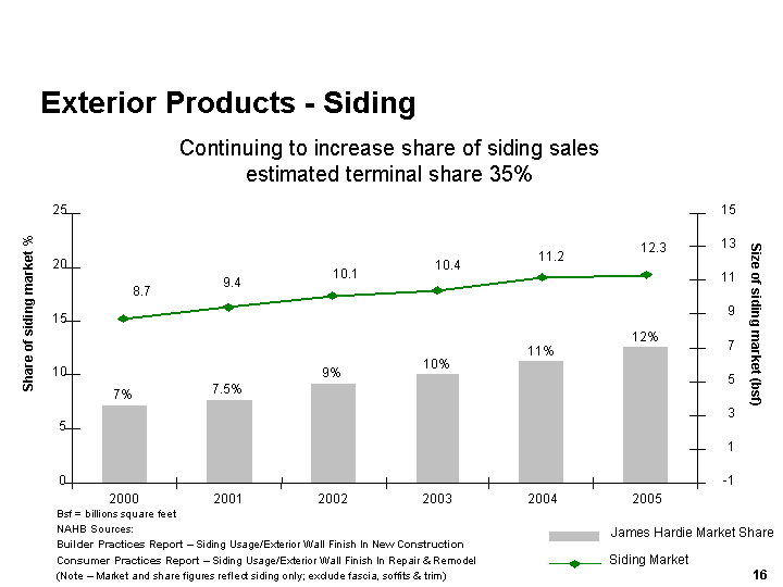 | Exterior Products - Siding Continuing to increase share of siding sales estimated terminal share 35% Bsf = billions square feet NAHB Sources: Builder Practices Report - Siding Usage/Exterior Wall Finish In New Construction Consumer Practices Report - Siding Usage/Exterior Wall Finish In Repair & Remodel (Note - Market and share figures reflect siding only; exclude fascia, soffits & trim) 7% 7.5% 9% 10% 11% 12% 8.7 9.4 10.1 10.4 11.2 12.3 0 5 10 15 20 25 2000 2001 2002 2003 2004 2005 Share of siding market % - -1 1 3 5 7 9 11 13 15 James Hardie Market Share Siding Market Size of siding market (bsf) |
