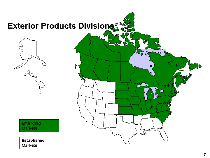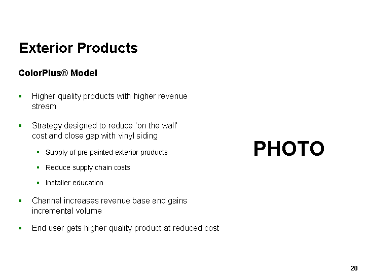 | Exterior Products ColorPlus(r) Model Higher quality products with higher revenue stream Strategy designed to reduce 'on the wall' cost and close gap with vinyl siding Supply of pre painted exterior products Reduce supply chain costs Installer education Channel increases revenue base and gains incremental volume End user gets higher quality product at reduced cost PHOTO |