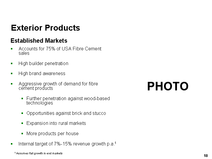 | Exterior Products Established Markets Accounts for 75% of USA Fibre Cement sales High builder penetration High brand awareness Aggressive growth of demand for fibre cement products Further penetration against wood-based technologies Opportunities against brick and stucco Expansion into rural markets More products per house Internal target of 7%-15% revenue growth p.a.1 1 Assumes flat growth in end markets PHOTO |