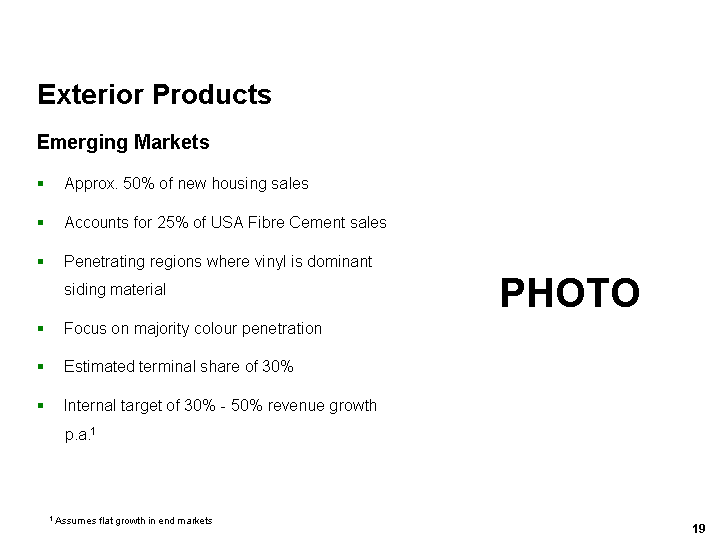 | Exterior Products Emerging Markets Approx. 50% of new housing sales Accounts for 25% of USA Fibre Cement sales Penetrating regions where vinyl is dominant siding material Focus on majority colour penetration Estimated terminal share of 30% Internal target of 30% - 50% revenue growth p.a.1 1 Assumes flat growth in end markets PHOTO |