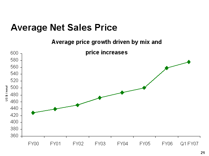 | Average Net Sales Price Average price growth driven by mix and price increases 360 380 400 420 440 460 480 500 520 540 560 580 600 FY00 FY01 FY02 FY03 FY04 FY05 FY06 Q1 FY07 US $ / mmsf |