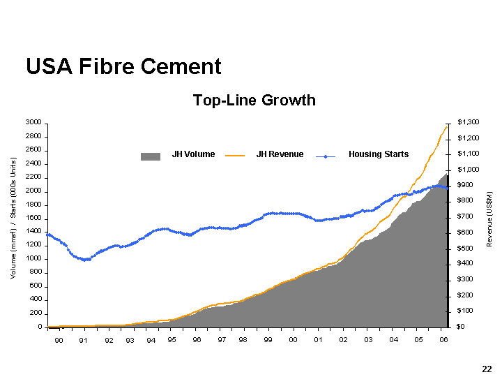 | USA Fibre Cement Top-Line Growth Top-Line Growth 0 200 400 600 800 1000 1200 1400 1600 1800 2000 2200 2400 2600 2800 3000 90 91 92 93 94 95 96 97 98 99 00 01 02 03 04 05 06 Volume (mmsf) / Starts (000s Units) $0 $100 $200 $300 $400 $500 $600 $700 $800 $900 $1,000 $1,100 $1,200 $1,300 Revenue (US$M) JH Volume JH Revenue Housing Starts |