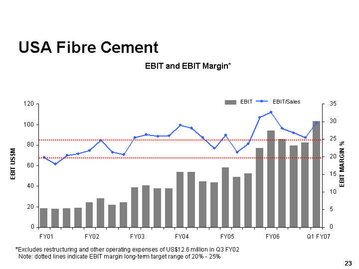| USA Fibre Cement *Excludes restructuring and other operating expenses of US$12.6 million in Q3 FY02 Note: dotted lines indicate EBIT margin long-term target range of 20% - 25% EBIT and EBIT Margin* 0 20 40 60 80 100 120 FY01 FY02 FY03 FY04 FY05 FY06 Q1 FY07 EBIT US$M 0 5 10 15 20 25 30 35 EBIT MARGIN % EBIT EBIT/Sales |