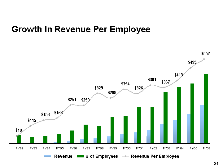 | Growth In Revenue Per Employee $552 $495 $48 $115 $153 $166 $251 $250 $329 $298 $354 $326 $381 $367 $413 FY92 FY93 FY94 FY95 FY96 FY97 FY98 FY99 FY00 FY01 FY02 FY03 FY04 FY05 FY06 Revenue # of Employees Revenue Per Employee |