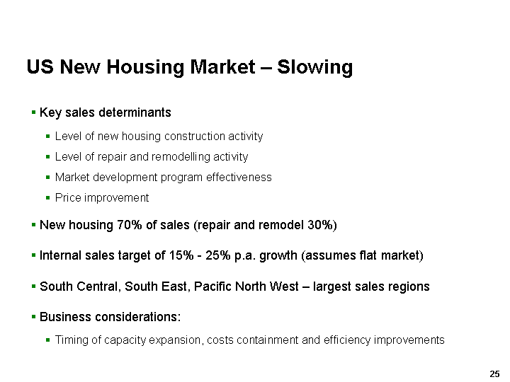 | US New Housing Market - Slowing Key sales determinants Level of new housing construction activity Level of repair and remodelling activity Market development program effectiveness Price improvement New housing 70% of sales (repair and remodel 30%) Internal sales target of 15% - 25% p.a. growth (assumes flat market) South Central, South East, Pacific North West - largest sales regions Business considerations: Timing of capacity expansion, costs containment and efficiency improvements |