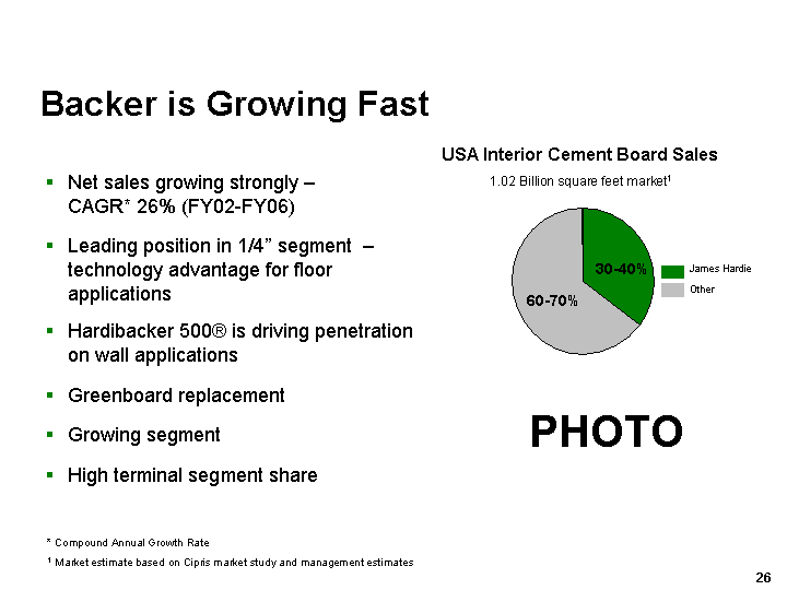| Backer is Growing Fast Net sales growing strongly - CAGR* 26% (FY02-FY06) Leading position in 1/4" segment - technology advantage for floor applications Hardibacker 500(r) is driving penetration on wall applications Greenboard replacement Growing segment High terminal segment share * Compound Annual Growth Rate 1 Market estimate based on Cipris market study and management estimates USA Interior Cement Board Sales 1.02 Billion square feet market1 James Hardie Other 30-40% 60-70% PHOTO |