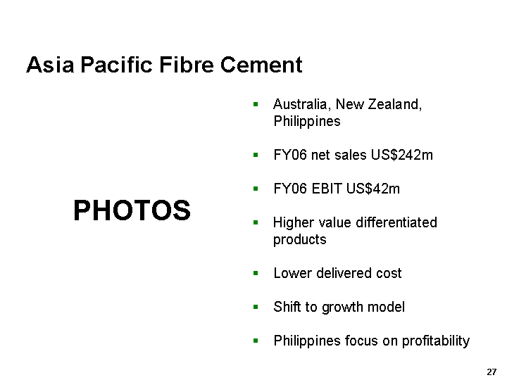 | Asia Pacific Fibre Cement Australia, New Zealand, Philippines FY06 net sales US$242m FY06 EBIT US$42m Higher value differentiated products Lower delivered cost Shift to growth model Philippines focus on profitability PHOTOS |