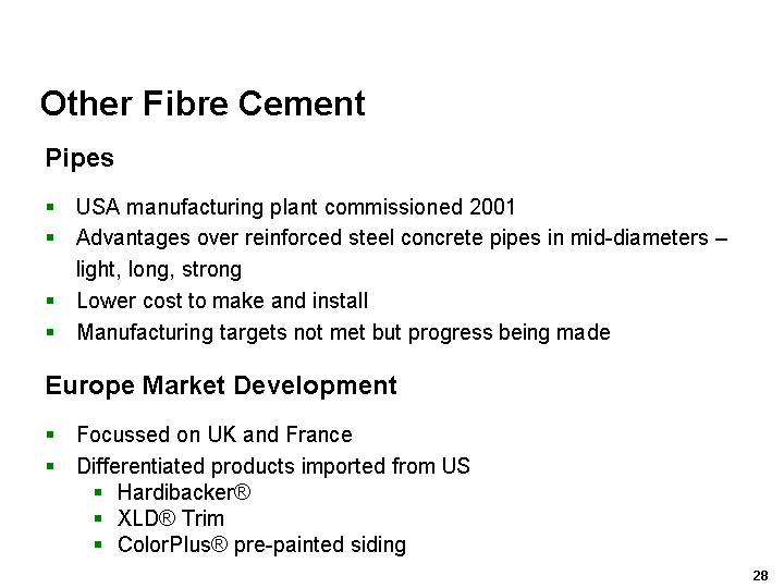 | Pipes USA manufacturing plant commissioned 2001 Advantages over reinforced steel concrete pipes in mid-diameters - light, long, strong Lower cost to make and install Manufacturing targets not met but progress being made Europe Market Development Focussed on UK and France Differentiated products imported from US Hardibacker(r) XLD(r) Trim ColorPlus(r) pre-painted siding Other Fibre Cement |