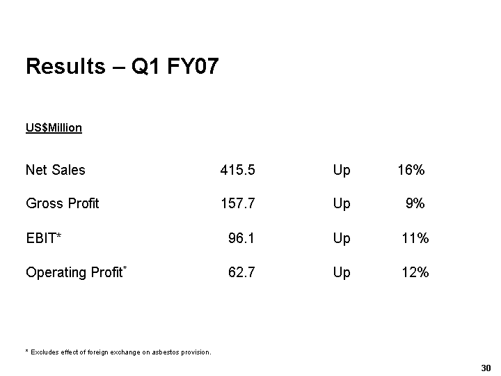 | Results - Q1 FY07 US$Million Net Sales 415.5 Up 16% Gross Profit 157.7 Up 9% EBIT* 96.1 Up 11% Operating Profit* 62.7 Up 12% * Excludes effect of foreign exchange on asbestos provision. |