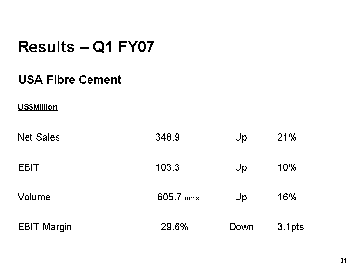 | Results - Q1 FY07 US$Million Net Sales 348.9 Up 21% EBIT 103.3 Up 10% Volume 605.7 mmsf Up 16% EBIT Margin 29.6% Down 3.1pts USA Fibre Cement |