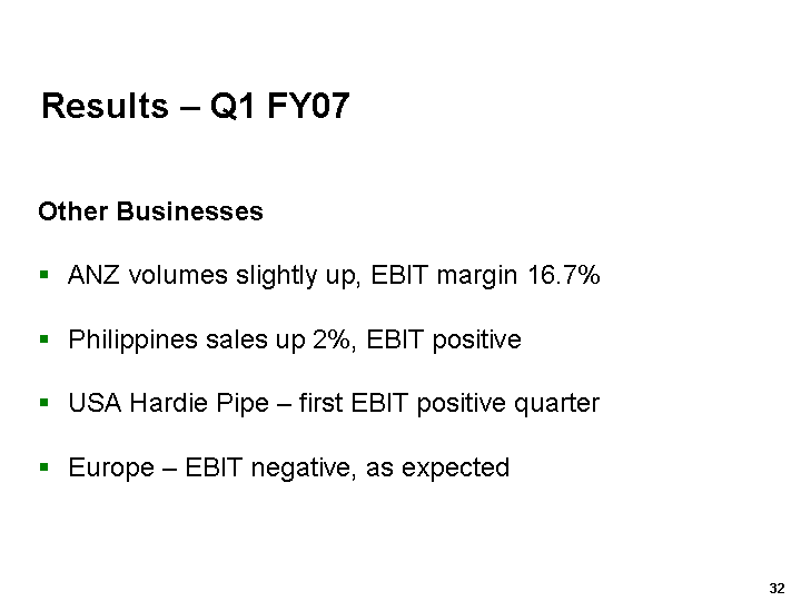 | Results - Q1 FY07 Other Businesses ANZ volumes slightly up, EBIT margin 16.7% Philippines sales up 2%, EBIT positive USA Hardie Pipe - first EBIT positive quarter Europe - EBIT negative, as expected |