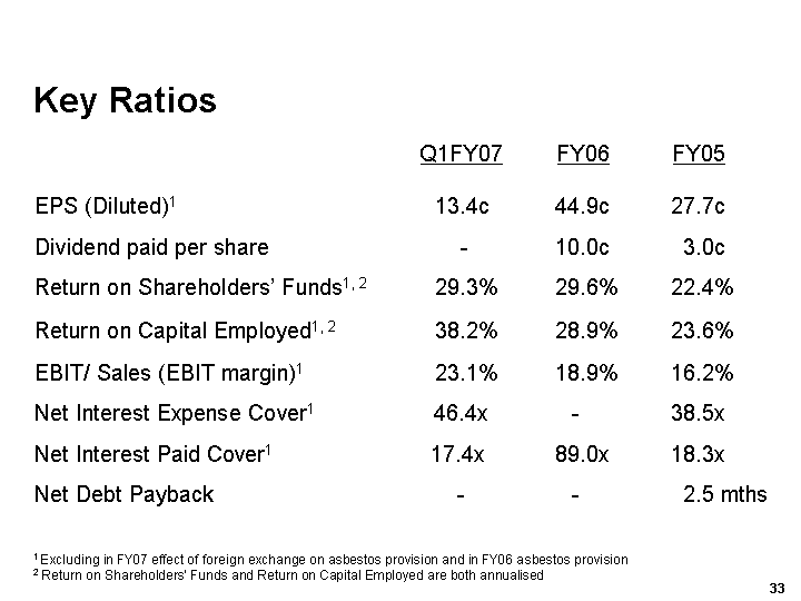 | Key Ratios Q1FY07 FY06 FY05 EPS (Diluted)1 13.4c 44.9c 27.7c Dividend paid per share - 10.0c 3.0c Return on Shareholders' Funds1, 2 29.3% 29.6% 22.4% Return on Capital Employed1, 2 38.2% 28.9% 23.6% EBIT/ Sales (EBIT margin)1 23.1% 18.9% 16.2% Net Interest Expense Cover1 46.4x - 38.5x Net Interest Paid Cover1 17.4x 89.0x 18.3x Net Debt Payback - - 2.5 mths 1 Excluding in FY07 effect of foreign exchange on asbestos provision and in FY06 asbestos provision 2 Return on Shareholders' Funds and Return on Capital Employed are both annualised |
