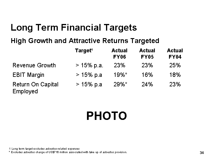 | High Growth and Attractive Returns Targeted Long Term Financial Targets Target1 Actual FY06 Actual FY05 Actual FY04 Revenue Growth > 15% p.a. 23% 23% 25% EBIT Margin > 15% p.a 19%* 16% 18% Return On Capital Employed > 15% p.a 29%* 24% 23% 1 Long term target excludes asbestos-related expenses * Excludes asbestos charge of US$716 million associated with take up of asbestos provision. PHOTO |