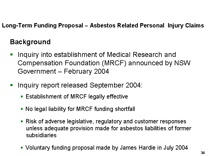 | Long-Term Funding Proposal - Asbestos Related Personal Injury Claims Background Inquiry into establishment of Medical Research and Compensation Foundation (MRCF) announced by NSW Government - February 2004 Inquiry report released September 2004: Establishment of MRCF legally effective No legal liability for MRCF funding shortfall Risk of adverse legislative, regulatory and customer responses unless adequate provision made for asbestos liabilities of former subsidiaries Voluntary funding proposal made by James Hardie in July 2004 |
