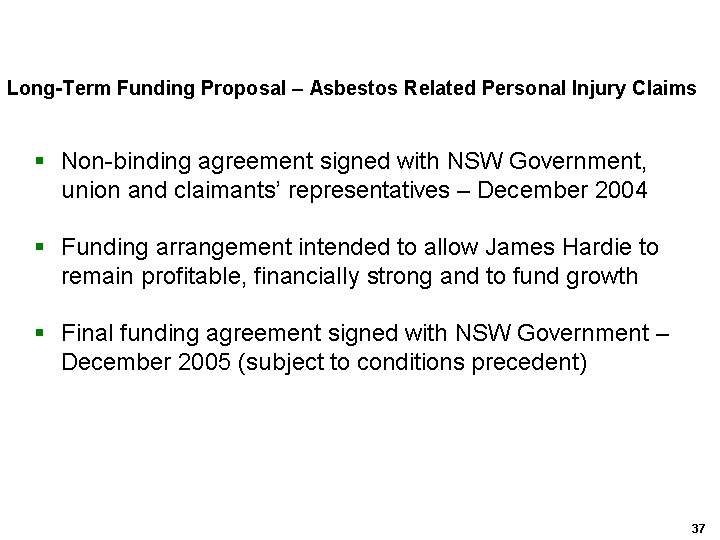 | Long-Term Funding Proposal - Asbestos Related Personal Injury Claims Non-binding agreement signed with NSW Government, union and claimants' representatives - December 2004 Funding arrangement intended to allow James Hardie to remain profitable, financially strong and to fund growth Final funding agreement signed with NSW Government - December 2005 (subject to conditions precedent) |