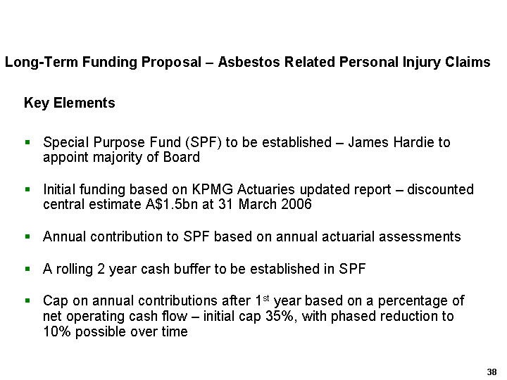| Long-Term Funding Proposal - Asbestos Related Personal Injury Claims Key Elements Special Purpose Fund (SPF) to be established - James Hardie to appoint majority of Board Initial funding based on KPMG Actuaries updated report - discounted central estimate A$1.5bn at 31 March 2006 Annual contribution to SPF based on annual actuarial assessments A rolling 2 year cash buffer to be established in SPF Cap on annual contributions after 1st year based on a percentage of net operating cash flow - initial cap 35%, with phased reduction to 10% possible over time |