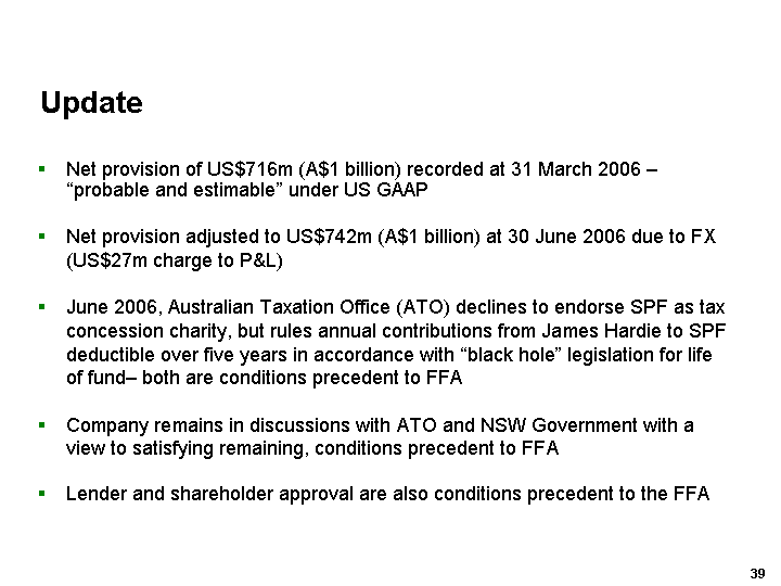 | Update Net provision of US$716m (A$1 billion) recorded at 31 March 2006 - "probable and estimable" under US GAAP Net provision adjusted to US$742m (A$1 billion) at 30 June 2006 due to FX (US$27m charge to P&L) June 2006, Australian Taxation Office (ATO) declines to endorse SPF as tax concession charity, but rules annual contributions from James Hardie to SPF deductible over five years in accordance with "black hole" legislation for life of fund- both are conditions precedent to FFA Company remains in discussions with ATO and NSW Government with a view to satisfying remaining, conditions precedent to FFA Lender and shareholder approval are also conditions precedent to the FFA |