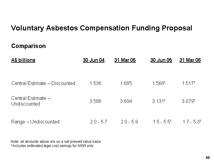 | Voluntary Asbestos Compensation Funding Proposal Comparison Comparison A$ billions 30 Jun 04 31 Mar 05 30 Jun 05 31 Mar 06 Central Estimate - Discounted 1.536 1.685 1.5681 1.5171 Central Estimate - Undiscounted 3.586 3.604 3.1311 3.0791 Range - Undiscounted 2.0 - 5.7 2.0 - 5.9 1.5 - 5.51 1.7 - 5.31 Note: all amounts above are on a net present value basis 1 Includes estimated legal cost savings for NSW only |
