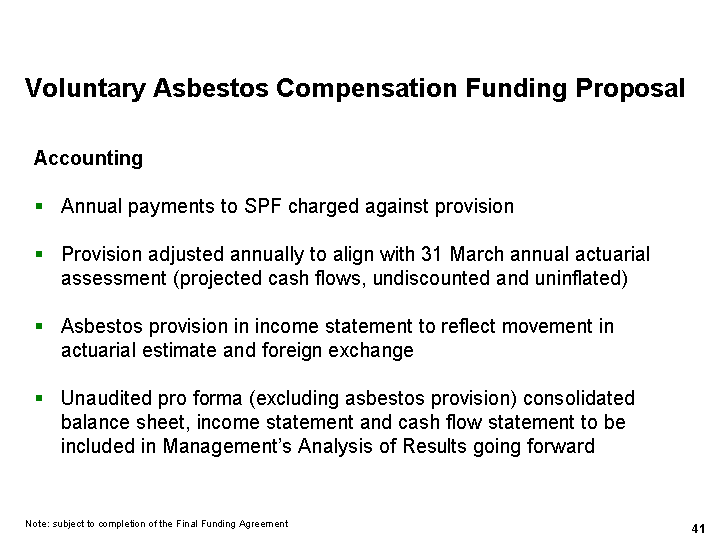| Voluntary Asbestos Compensation Funding Proposal Accounting Annual payments to SPF charged against provision Provision adjusted annually to align with 31 March annual actuarial assessment (projected cash flows, undiscounted and uninflated) Asbestos provision in income statement to reflect movement in actuarial estimate and foreign exchange Unaudited pro forma (excluding asbestos provision) consolidated balance sheet, income statement and cash flow statement to be included in Management's Analysis of Results going forward Note: subject to completion of the Final Funding Agreement |