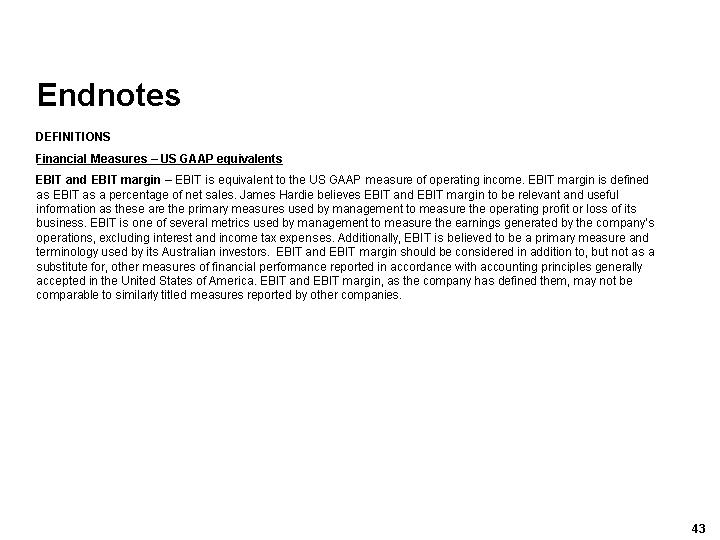 | Endnotes DEFINITIONS Financial Measures - US GAAP equivalents EBIT and EBIT margin - EBIT is equivalent to the US GAAP measure of operating income. EBIT margin is defined as EBIT as a percentage of net sales. James Hardie believes EBIT and EBIT margin to be relevant and useful information as these are the primary measures used by management to measure the operating profit or loss of its business. EBIT is one of several metrics used by management to measure the earnings generated by the company's operations, excluding interest and income tax expenses. Additionally, EBIT is believed to be a primary measure and terminology used by its Australian investors. EBIT and EBIT margin should be considered in addition to, but not as a substitute for, other measures of financial performance reported in accordance with accounting principles generally accepted in the United States of America. EBIT and EBIT margin, as the company has defined them, may not be comparable to similarly titled measures reported by other companies. |