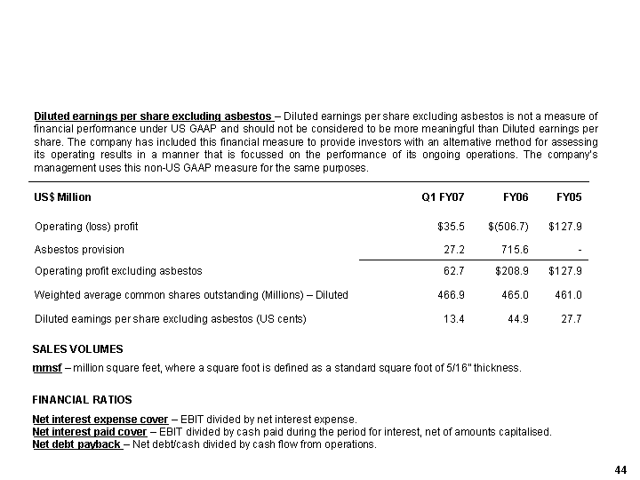 | Diluted earnings per share excluding asbestos - Diluted earnings per share excluding asbestos is not a measure of financial performance under US GAAP and should not be considered to be more meaningful than Diluted earnings per share. The company has included this financial measure to provide investors with an alternative method for assessing its operating results in a manner that is focussed on the performance of its ongoing operations. The company's management uses this non-US GAAP measure for the same purposes. US$ Million Q1 FY07 FY06 FY05 Operating (loss) profit $35.5 $(506.7) $127.9 Asbestos provision 27.2 715.6 - Operating profit excluding asbestos 62.7 $208.9 $127.9 Weighted average common shares outstanding (Millions) - Diluted 466.9 465.0 461.0 Diluted earnings per share excluding asbestos (US cents) 13.4 44.9 27.7 SALES VOLUMES mmsf - million square feet, where a square foot is defined as a standard square foot of 5/16" thickness. FINANCIAL RATIOS Net interest expense cover - EBIT divided by net interest expense. Net interest paid cover - EBIT divided by cash paid during the period for interest, net of amounts capitalised. Net debt payback - Net debt/cash divided by cash flow from operations. |