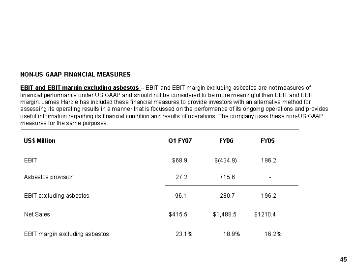 | NON-US GAAP FINANCIAL MEASURES EBIT and EBIT margin excluding asbestos - EBIT and EBIT margin excluding asbestos are not measures of financial performance under US GAAP and should not be considered to be more meaningful than EBIT and EBIT margin. James Hardie has included these financial measures to provide investors with an alternative method for assessing its operating results in a manner that is focussed on the performance of its ongoing operations and provides useful information regarding its financial condition and results of operations. The company uses these non-US GAAP measures for the same purposes. US$ Million Q1 FY07 FY06 FY05 EBIT $68.9 $(434.9) 196.2 Asbestos provision 27.2 715.6 - EBIT excluding asbestos 96.1 280.7 196.2 Net Sales $415.5 $1,488.5 $1210.4 EBIT margin excluding asbestos 23.1% 18.9% 16.2% |