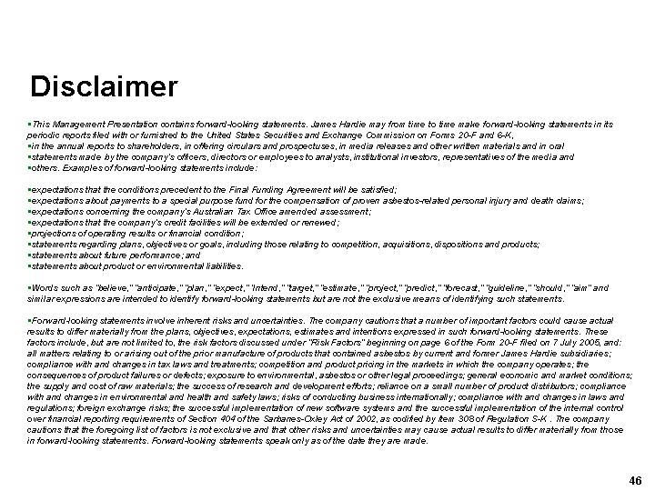 | Disclaimer This Management Presentation contains forward-looking statements. James Hardie may from time to time make forward-looking statements in its periodic reports filed with or furnished to the United States Securities and Exchange Commission on Forms 20-F and 6-K, in the annual reports to shareholders, in offering circulars and prospectuses, in media releases and other written materials and in oral statements made by the company's officers, directors or employees to analysts, institutional investors, representatives of the media and others. Examples of forward-looking statements include: expectations that the conditions precedent to the Final Funding Agreement will be satisfied; expectations about payments to a special purpose fund for the compensation of proven asbestos-related personal injury and death claims; expectations concerning the company's Australian Tax Office amended assessment; expectations that the company's credit facilities will be extended or renewed; projections of operating results or financial condition; statements regarding plans, objectives or goals, including those relating to competition, acquisitions, dispositions and products; statements about future performance; and statements about product or environmental liabilities. Words such as "believe," "anticipate," "plan," "expect," "intend," "target," "estimate," "project," "predict," "forecast," "guideline," "should," "aim" and similar expressions are intended to identify forward-looking statements but are not the exclusive means of identifying such statements. Forward-looking statements involve inherent risks and uncertainties. The company cautions that a number of important factors could cause actual results to differ materially from the plans, objectives, expectations, estimates and intentions expressed in such forward-looking statements. These factors include, but are not limited to, the risk factors discussed under "Risk Factors" beginning on page 6 of the Form 20-F filed on 7 July 2005, and: all matters relating to or arising out of the prior manufacture of products that contained asbestos by current and former James Hardie subsidiaries; compliance with and changes in tax laws and treatments; competition and product pricing in the markets in which the company operates; the consequences of product failures or defects; exposure to environmental, asbestos or other legal proceedings; general economic and market conditions; the supply and cost of raw materials; the success of research and development efforts; reliance on a small number of product distributors; compliance with and changes in environmental and health and safety laws; risks of conducting business internationally; compliance with and changes in laws and regulations; foreign exchange risks; the successful implementation of new software systems and the successful implementation of the internal control over financial reporting requirements of Section 404 of the Sarbanes-Oxley Act of 2002, as codified by Item 308 of Regulation S-K . The company cautions that the foregoing list of factors is not exclusive and that other risks and uncertainties may cause actual results to differ materially from those in forward-looking statements. Forward-looking statements speak only as of the date they are made. |