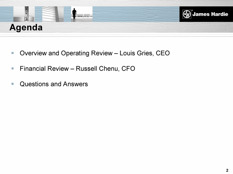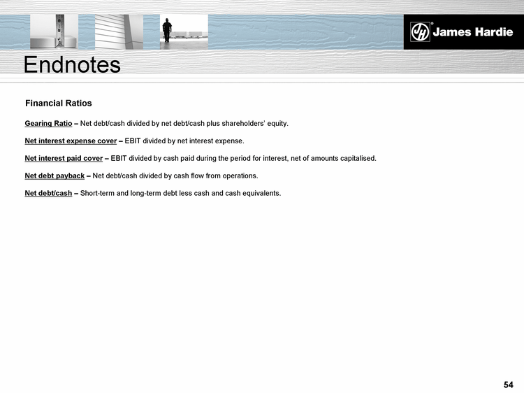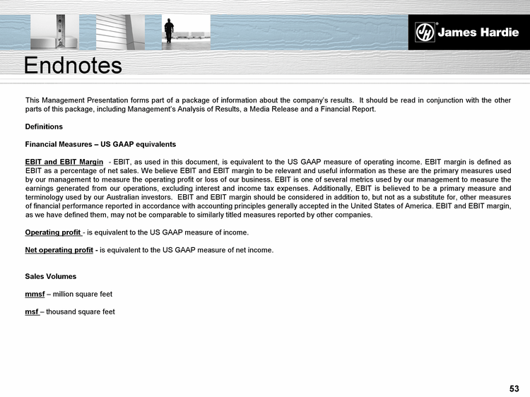 | This Financial Report of results contains forward-looking statements. James Hardie may from time to time make forward-looking statements in its periodic reports filed with or furnished to the United States Securities and Exchange Commission on Forms 20-F and 6-K, in the annual reports to shareholders, in offering circulars, invitation memoranda and prospectuses, in media releases and other written materials and in oral statements made by the Companys officers, directors or employees to analysts, institutional investors, lenders and potential lenders, representatives of the media and others. Examples of forward-looking statements include: |