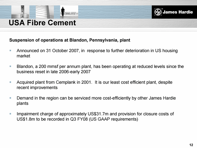 | On 31 October 2007, the Company announced plans to suspend production at its Blandon, Pennsylvania plant in North America. The Company will record an impairment of approximately US$31.7 million and a provision for closure costs currently estimated at US$1.8 million in the third quarter of fiscal year 2008. | ||