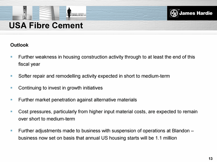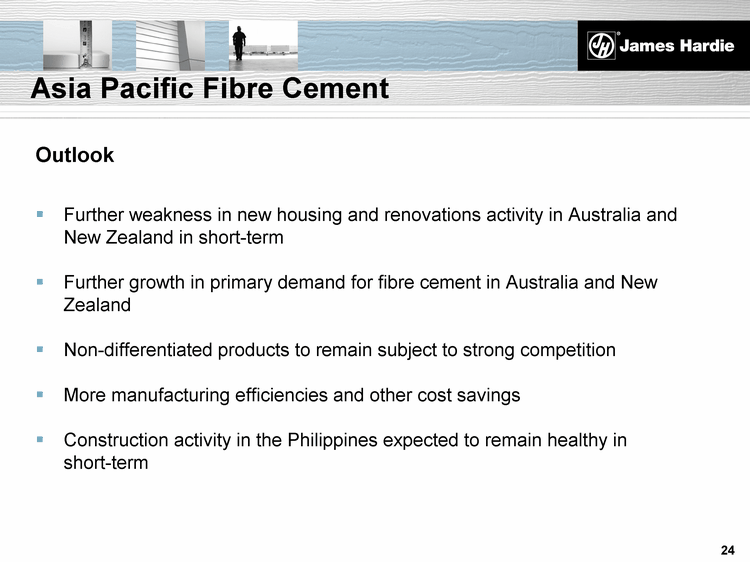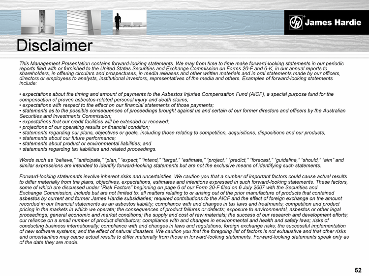 | Forward-looking statements involve inherent risks and uncertainties. The Company cautions that a number of important factors could cause actual results to differ materially from the plans, objectives, expectations, estimates and intentions expressed in such forward-looking statements. These factors, some of which are discussed under Risk Factors beginning on page 6 of the Form 20-F filed on 6 July 2007 with the Securities and Exchange Commission, include but are not limited to: all matters relating to or arising out of the prior manufacture of products that contained asbestos by current and former James Hardie subsidiaries; required contributions to the AICF and the effect of foreign exchange on the amount recorded in the Companys financial statements as an asbestos liability; compliance with and changes in tax laws and treatments; competition and product pricing in the markets in which the Company operates; the consequences of product failures or defects; exposure to environmental, asbestos or other legal proceedings; general economic and market conditions; the supply and cost of raw materials; the success of research and development efforts; reliance on a small number of product distributors; compliance with and changes in environmental and health and safety laws; risks of conducting business internationally; compliance with and changes in laws and regulations; foreign exchange risks; the successful implementation of new software systems; and the effect of natural disasters. The Company cautions that the foregoing list of factors is not exhaustive and that other risks and uncertainties may cause actual results to differ materially from those in forward-looking statements. Forward-looking statements speak only as of the date they are made. |