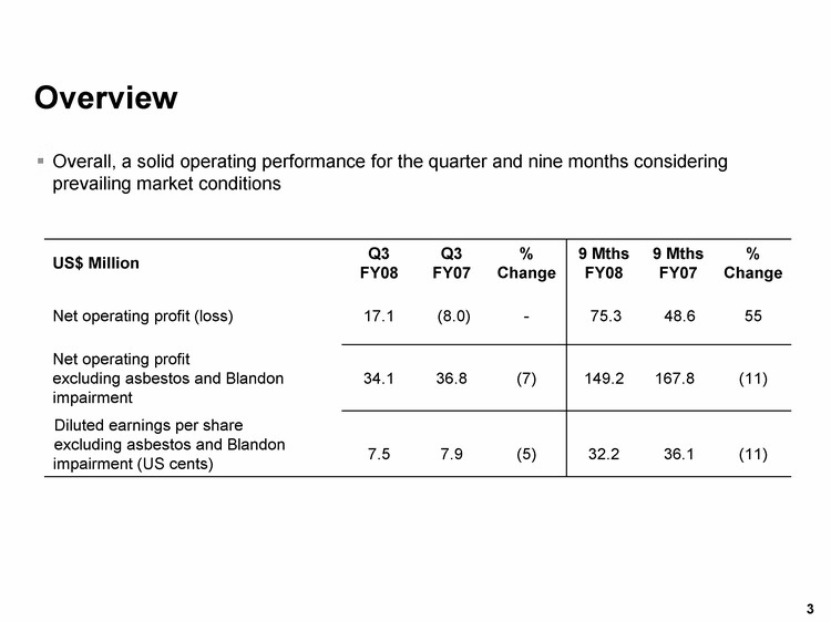 | Media Release: James Hardie 3rd Quarter and Nine Months FY08 | 3 |